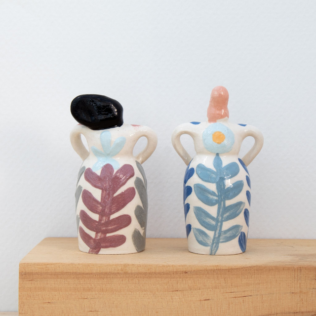 Each miniature is created out of small, hand thrown forms made on the potter's wheel. Smaller details such as arms, hair and little birds are modelled on afterwards, and all decoration is applied by hand.
