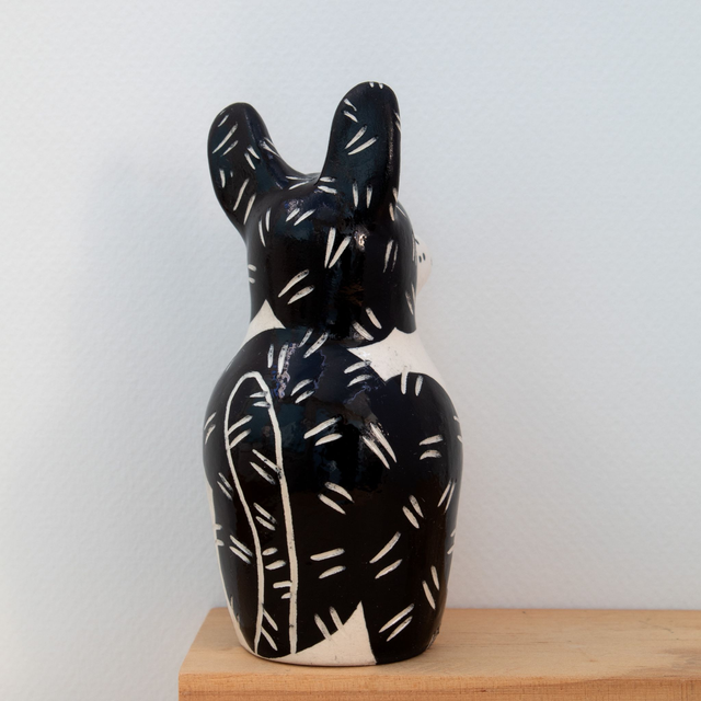 Each figure is slip cast using a handmade plaster mould made from an original clay model. Once assembled the piece is decorated with black underglaze, the detail is then drawn into this by hand.